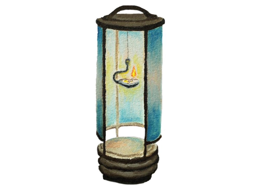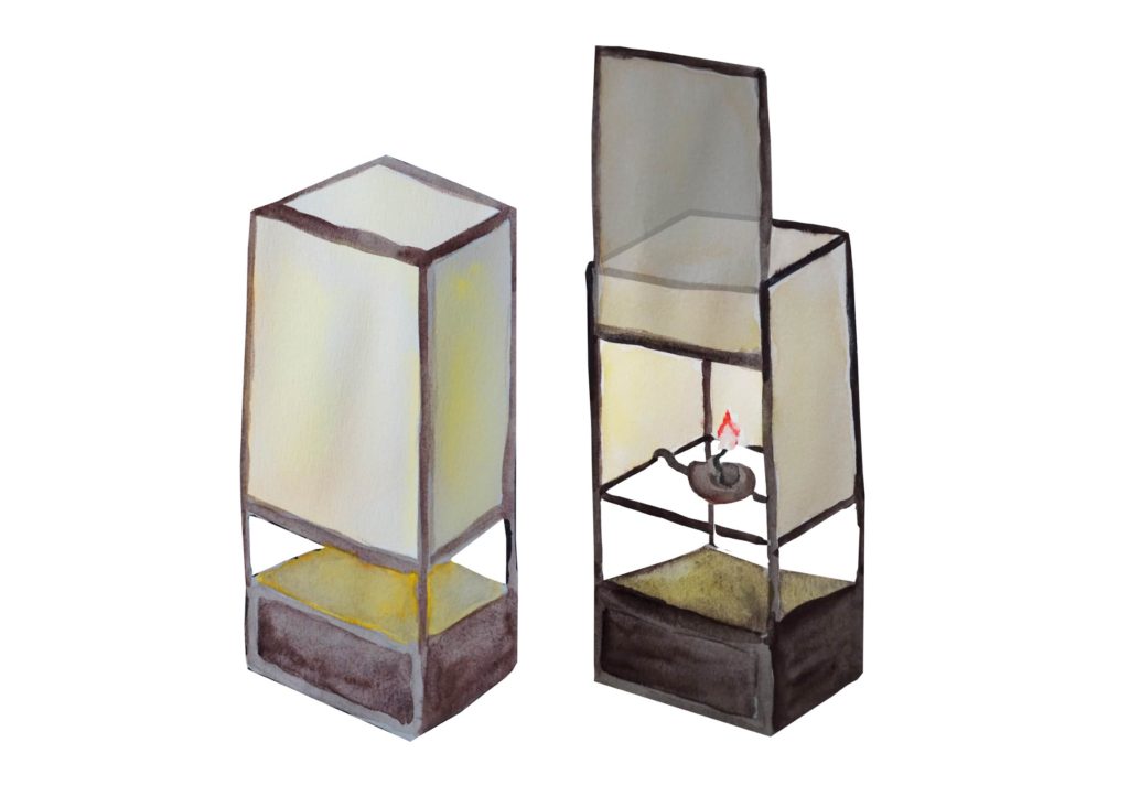 行灯とは昔の照明で、和紙を貼ってある木枠に中に油の入った皿が置いてあり、そこに灯心といわれる紐ひもが浸かっていてその紐ひもに火がついています。